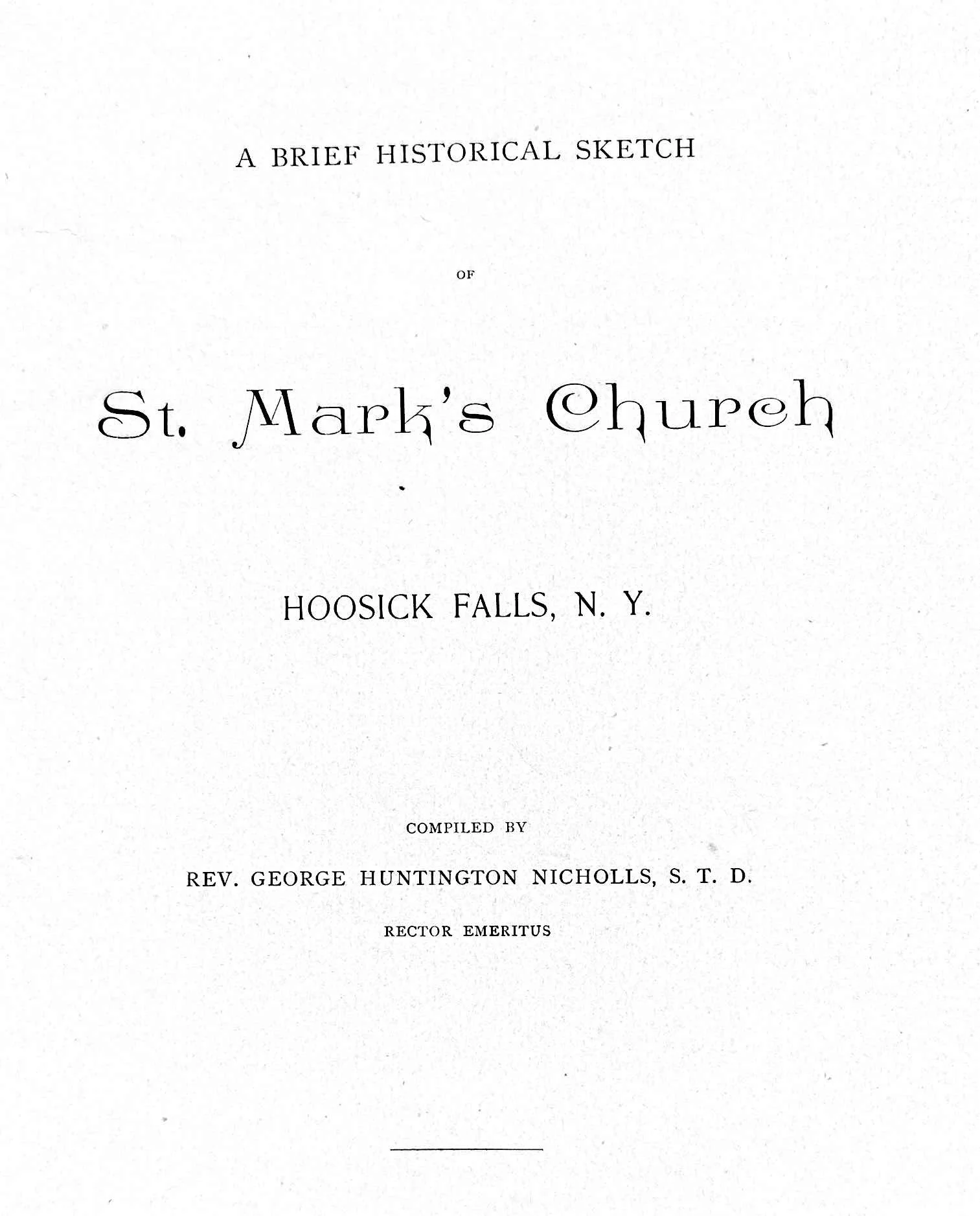 The work here was compiled by the Rector Emeritus, George Huntington Nicholls. It traces the history of St. Mark’s from the early days of Hoosick Falls, the church’s establishment in 1834, the building of the present church in 1860, and finally to the call of the Reverend George D. Stillman to be Rector in 1881. It is a delightful and inspiring story to read.